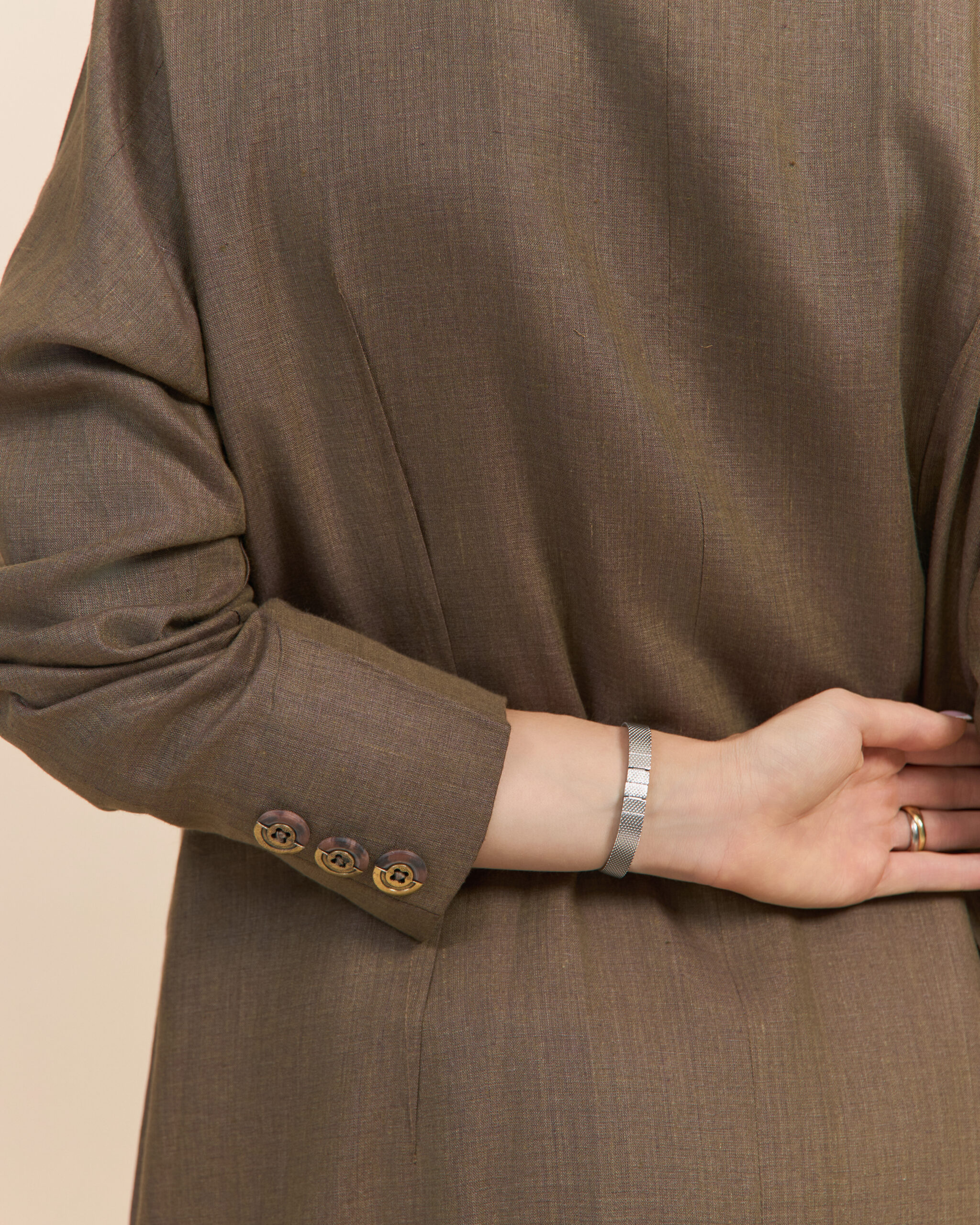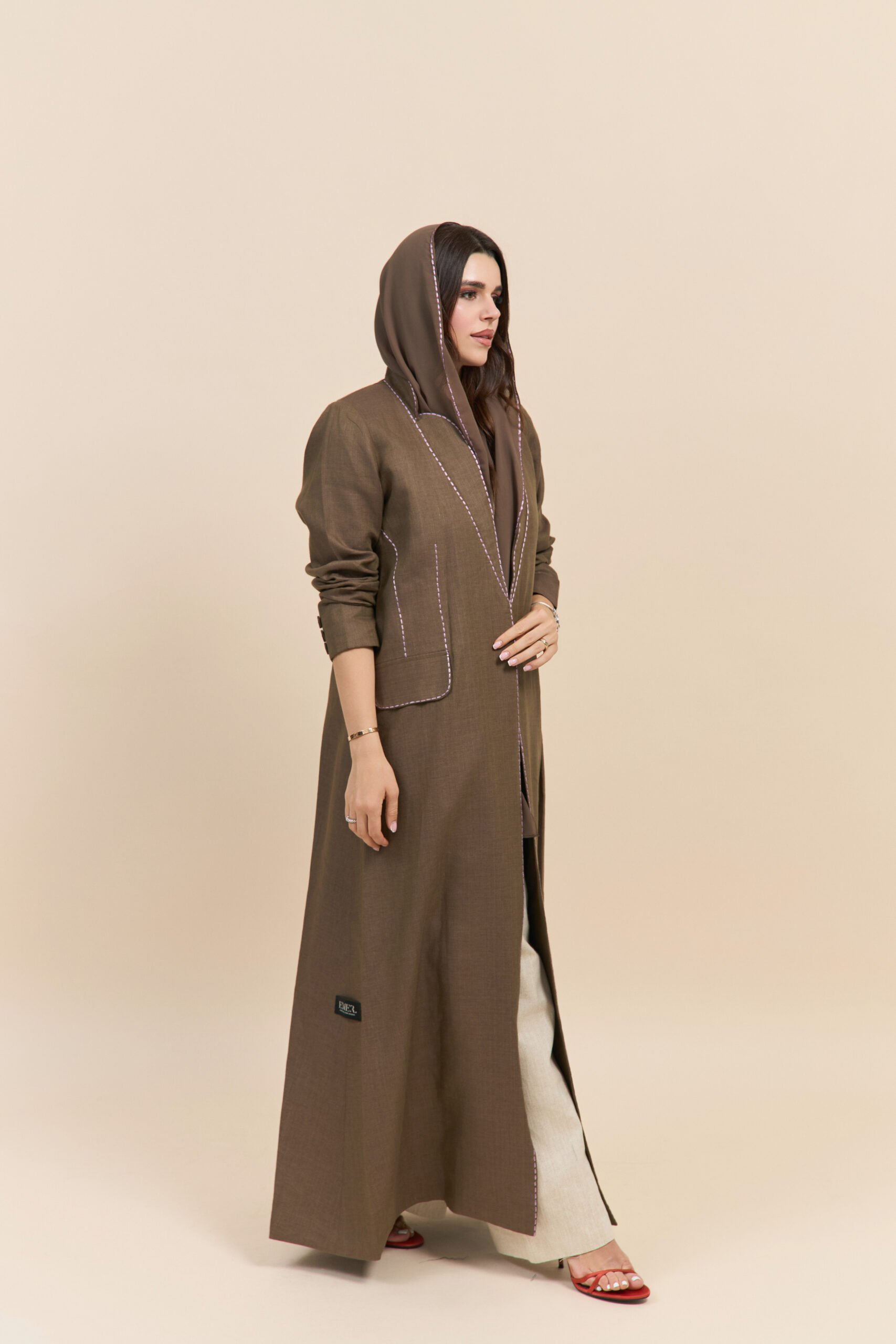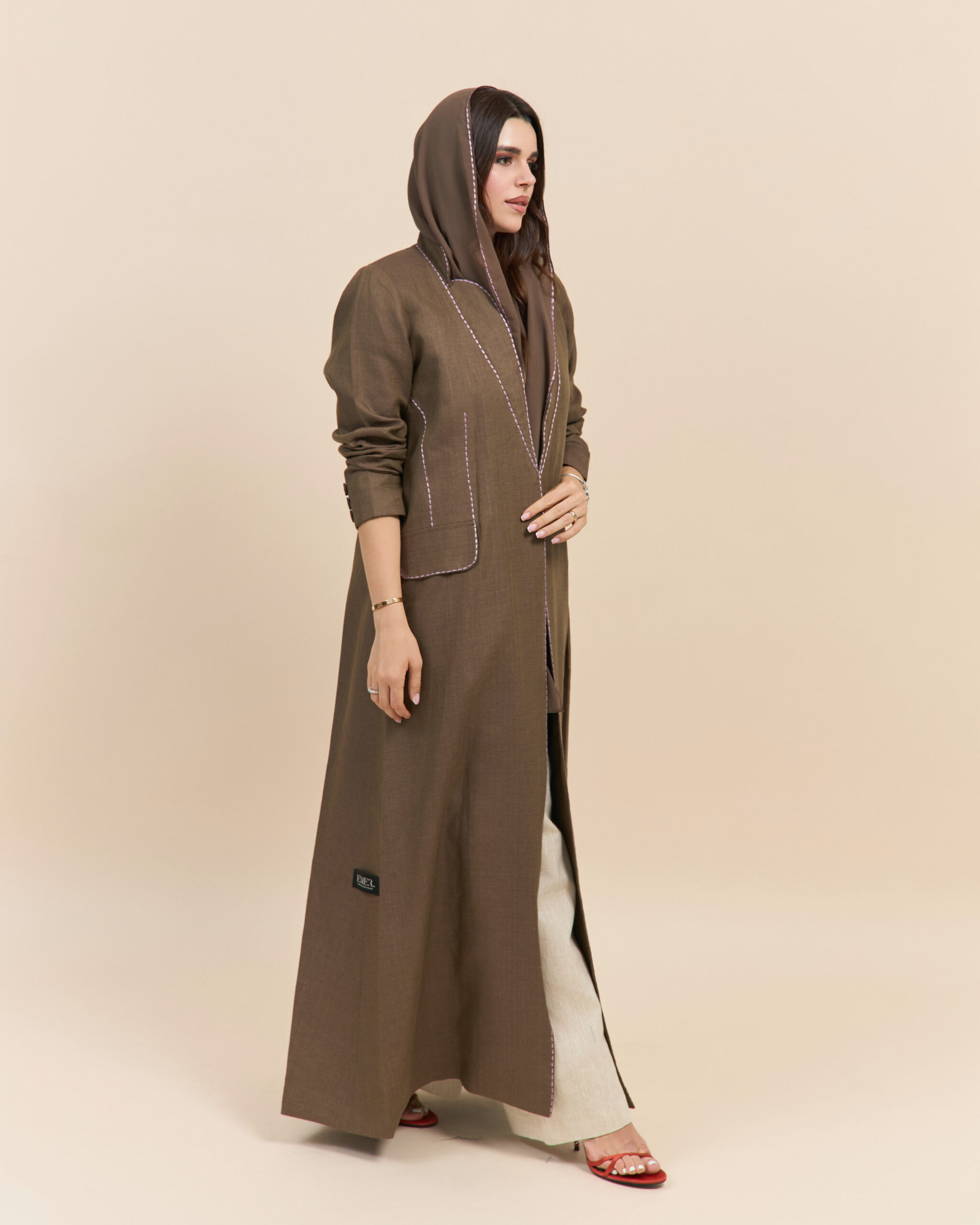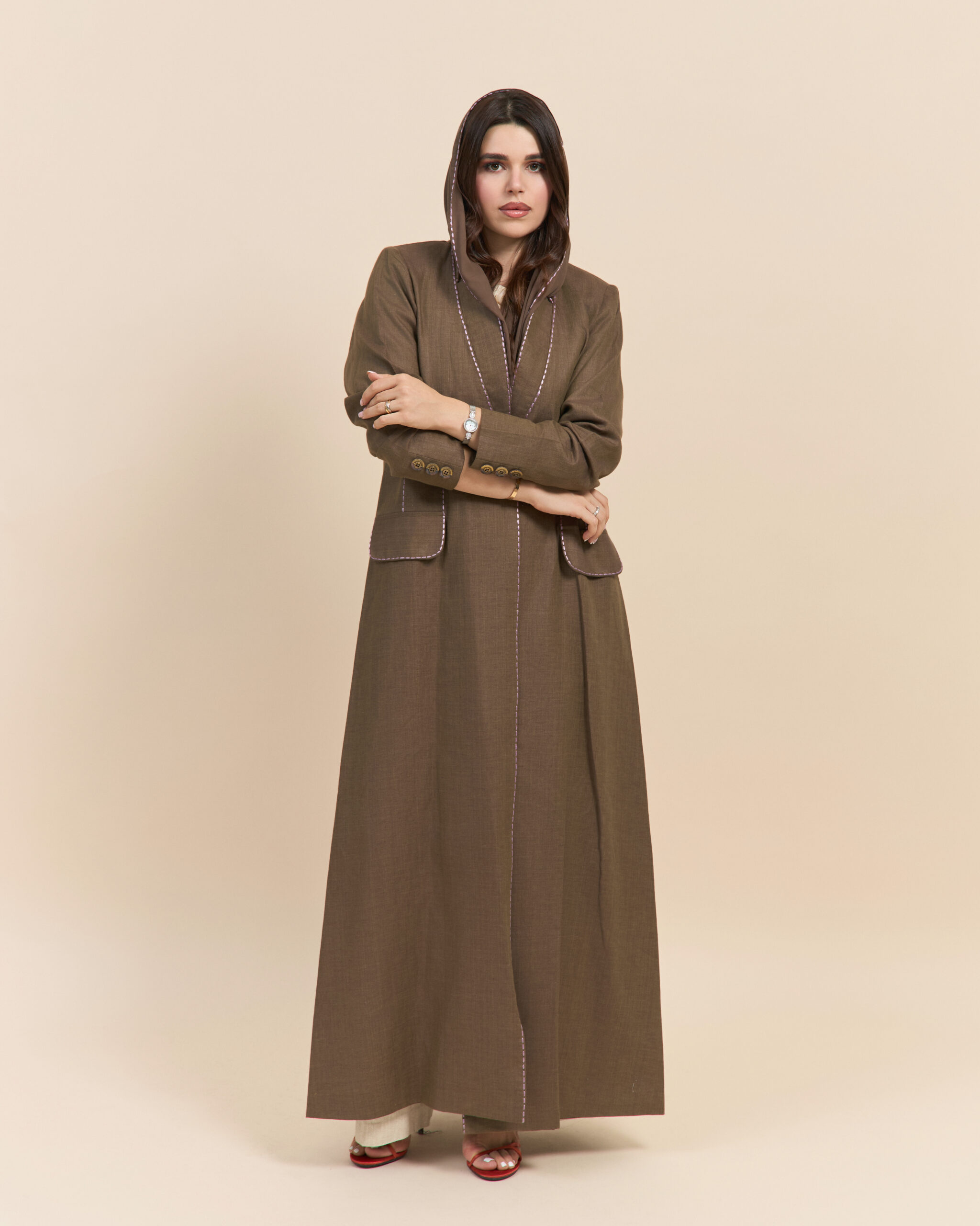 القماش: 100% كتان نقي، بنسج مزدوج بخيوط زيتونية وأرجوانية ناعمة لتباين ثلاثي الأبعاد