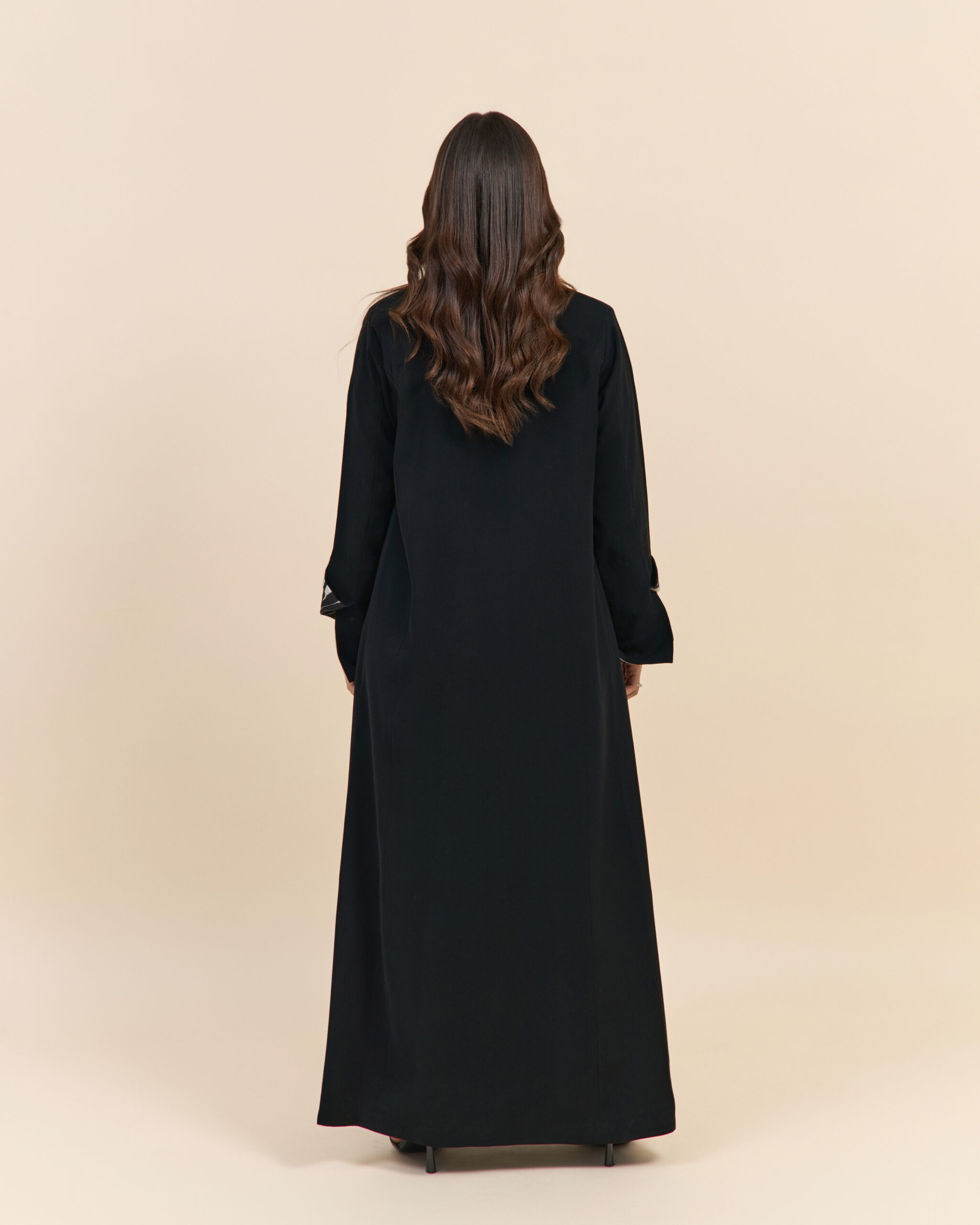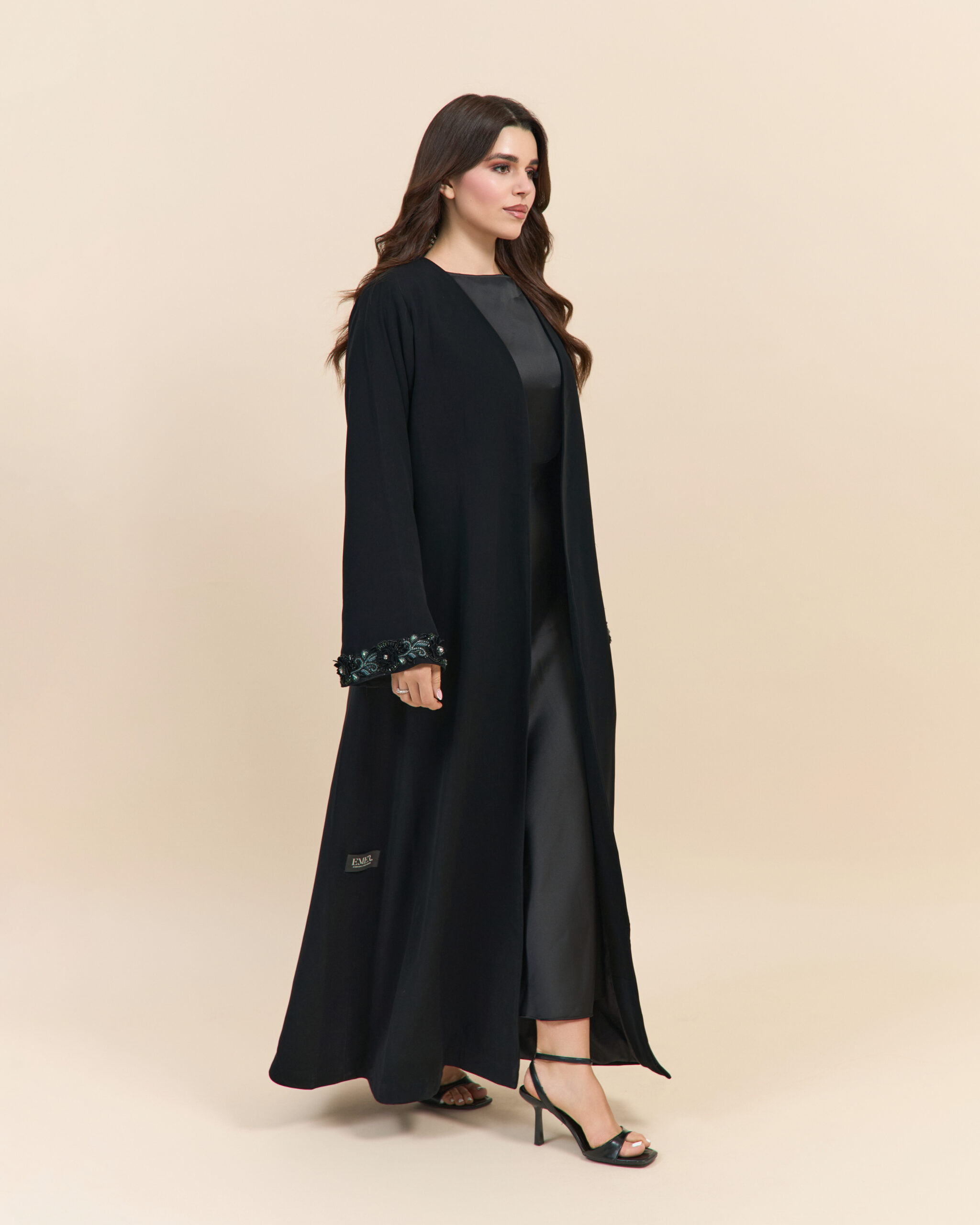 التفاصيل: تطريز هندي يدوي مزين بزهور مخملية، وأحجار زجاجية، وعمل خرز فاخر بألوان غنية من الأسود، والتركواز، والأخضر.