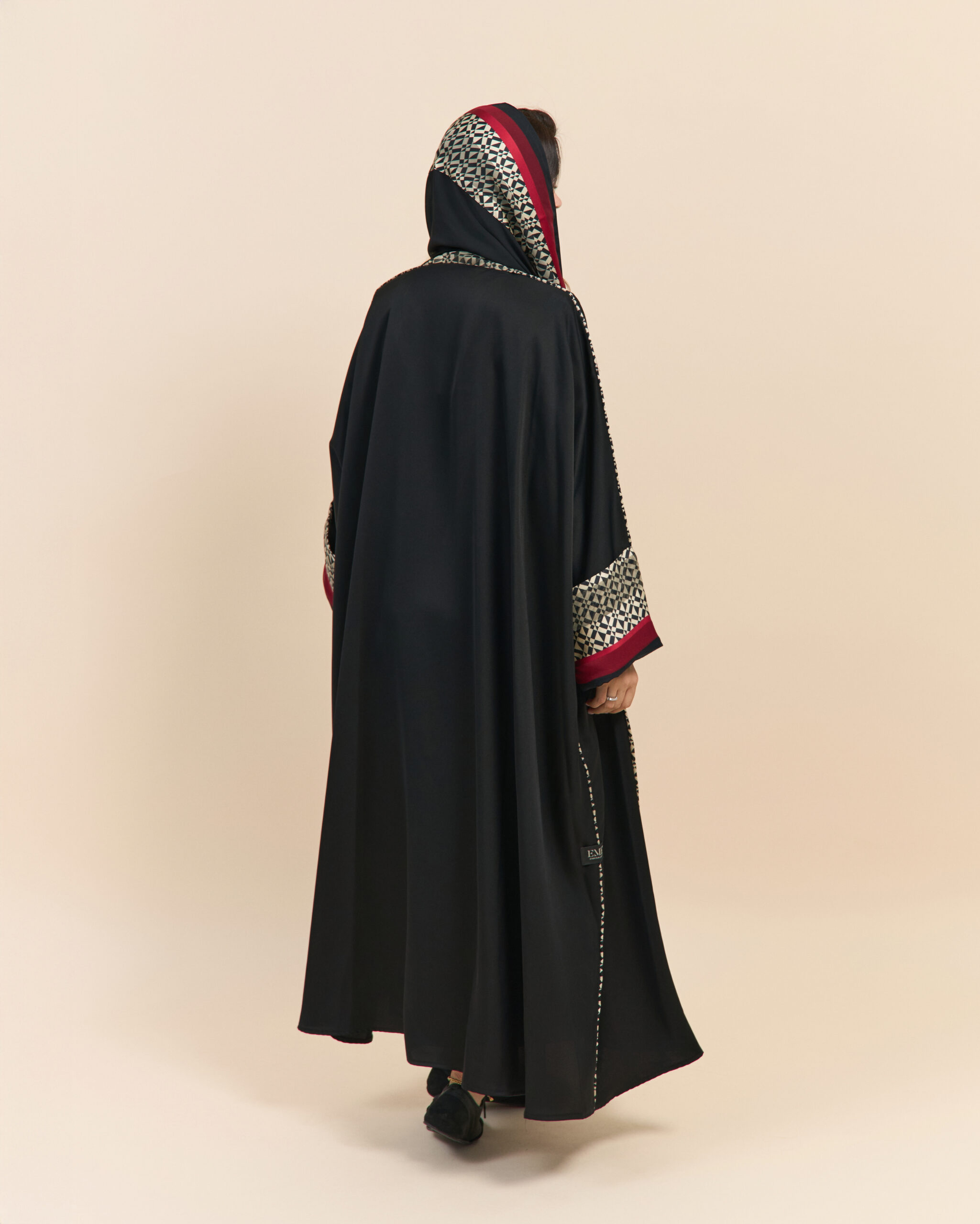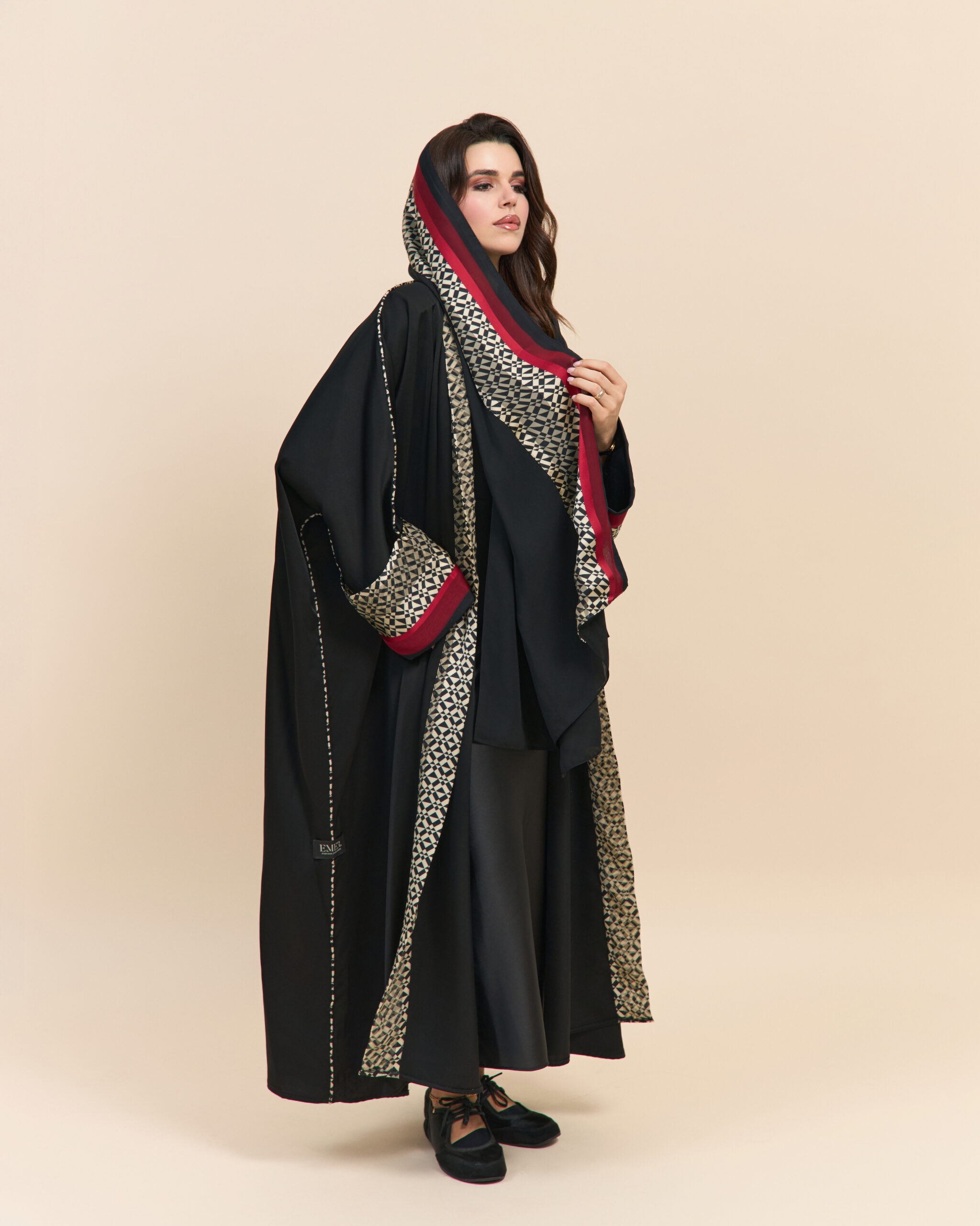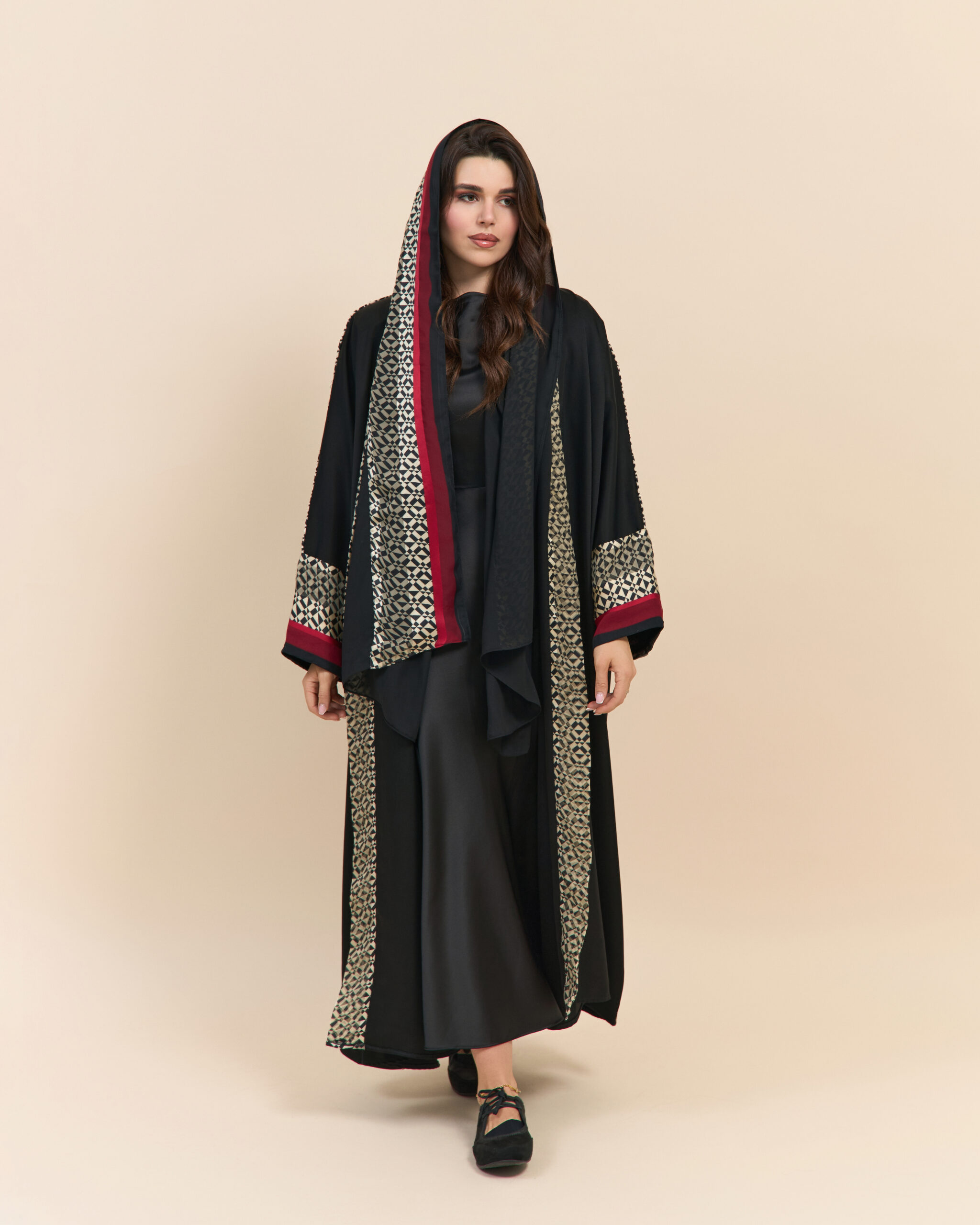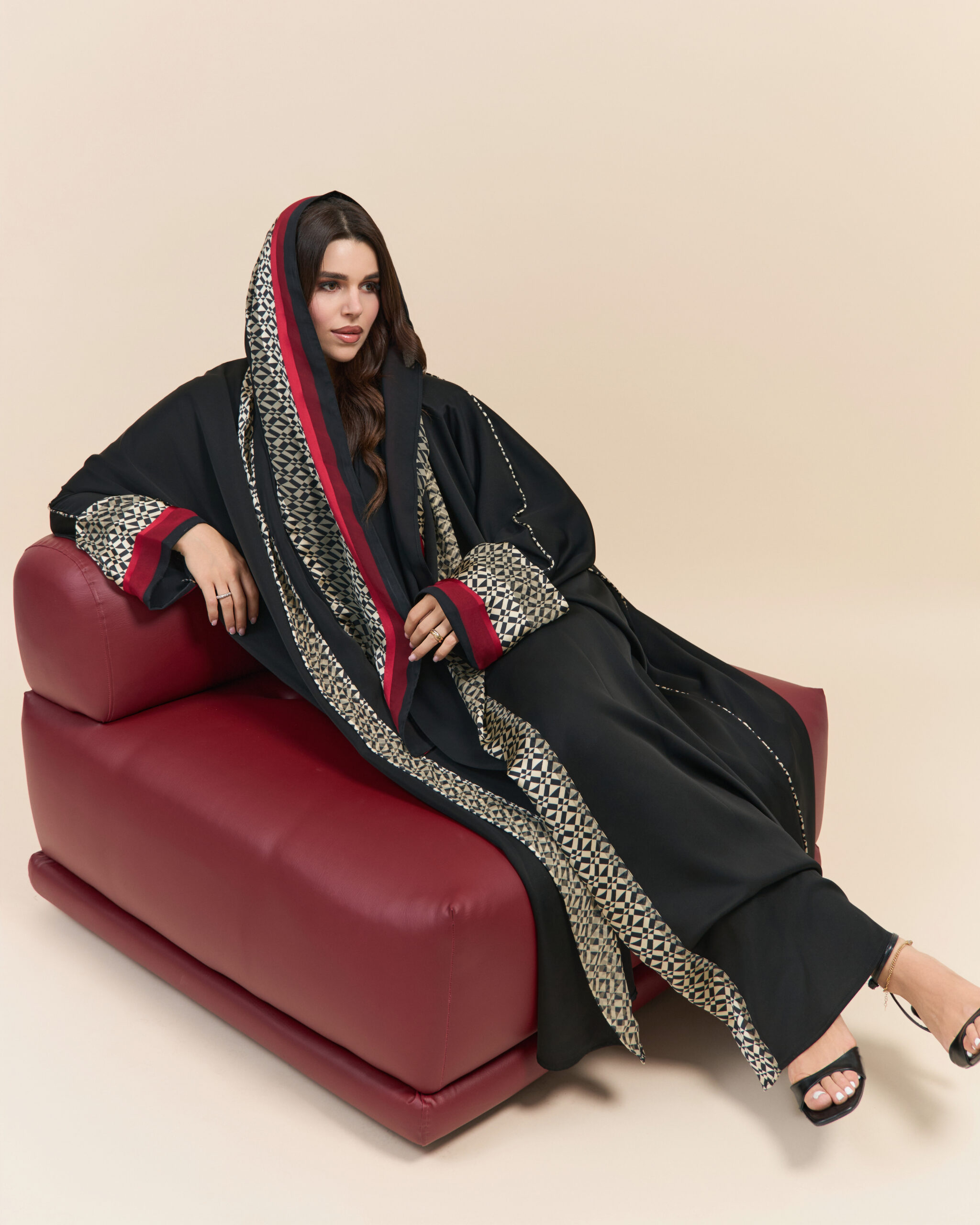 التفاصيل: تطريز حصري من تصميم الدار، منسّق بحدود عميقة باللون العنّابي.